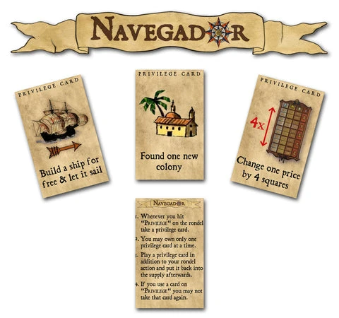 Privilege Cards is an expansion for Navegador. It consists of 8 stable cardboard cards (7 unique cards and a rules summary card) plus rules. The cards are played in addition to the players normal action and therefore enrich Navegador with new tactics and strategies.