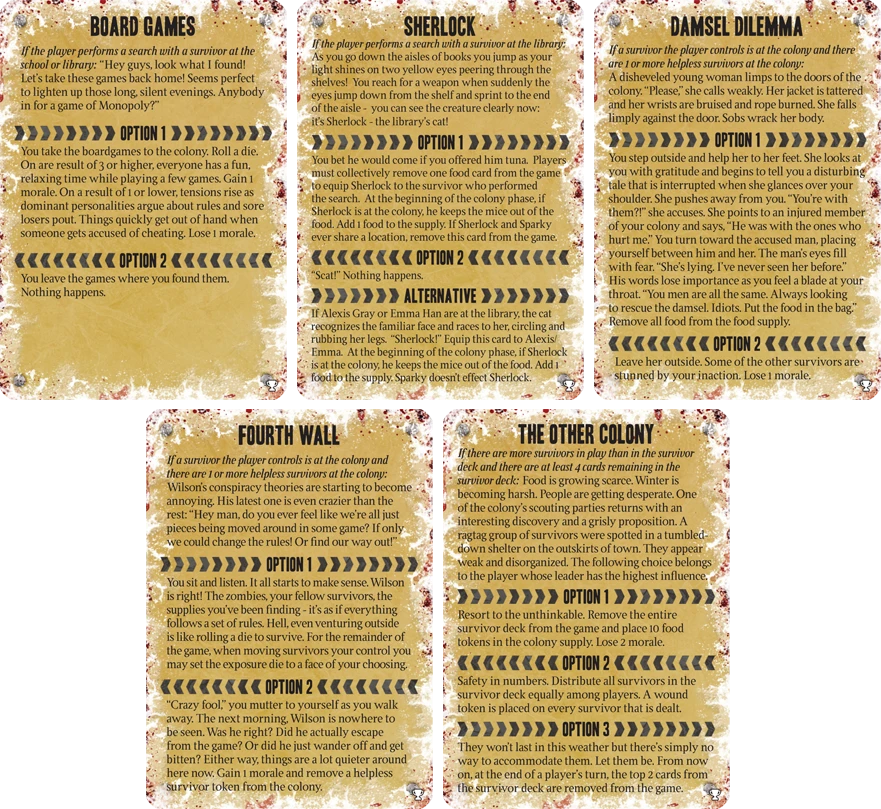 Dead of Winter: BGG Crossroads Promo is a pack of 5 crossroads cards generated by the BoardGameGeek community, and officially printed with the kind help of Plaid Hat Games. The cards included are: