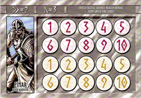 Einar has the special ability “Shield Tactics: ignores health damage from greek fire cards”.