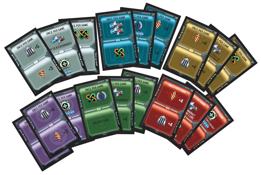 Exodus: Edge of Extinction – Action Cards contains 18 action cards (3 per faction), for use with Exodus: Edge of Extinction.