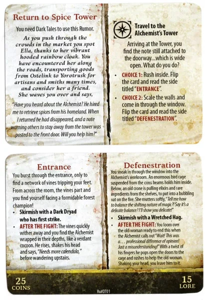 A new rumor card for Folklore: The Affliction. You need Dark Tales to use this Rumor. The card has you travel to the Alchemist’s Tower. You then have the choice titled “Entrance” or “Defenestration.”
