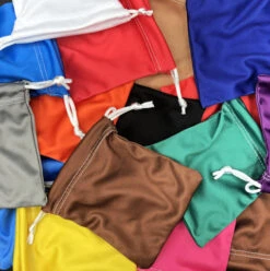 A set of five drawstring bags to store and draw tiles from in Clans of Caledonia. These are sublimation printed microfiber bags, with the smaller bags measuring 10 cm deep by 9 cm wide, and the larger bags 16 cm deep by 13 cm wide.