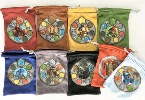 A set of nine drawstring bags featuring original artwork from the game Terra Mystica, used to store the wooden players pieces in each color. Each bag is 9cm x 12cm and is made from microfiber fabric. Each bag has the image of one faction on one side, and the other matching color faction on the other, including the two additional races from the Fire & Ice expansion.