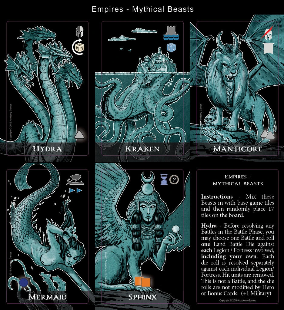 The Mare Nostrum: Empires – Mythical Beasts Expansion Tiles are fully compatible with Mare Nostrum – Empires. These creatures feature new additions, such as:
