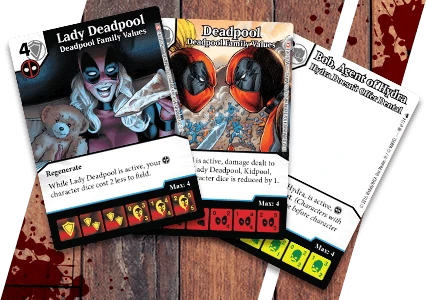 These cards feature fun versions of Deadpool, Lady Deadpool, and Bob, Agent of Hydra. Corresponding dice separate (Marvel Dice Masters: Deadpool).
