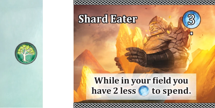 The Shard Eater advancement has the lowest mana cost for a growth symbol in the game, allowing you to add a growth to your deck as early as the first turn. However, this early power comes with a longterm price of lowering your mana during future turns while it’s in your field. Placing a Shard Eater advancement in a card with a Cursed Land will neutralize its decay symbol, allow you to sow your field with more cards.