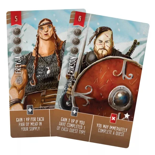 These promo cards were originally available through online retail in June of 2018, and then afterwards they part of the rewards for backing Game Boy Geek 2021 Kickstarter campaign. Both Jarls require both Fields of Fame and Hall of Heroes.